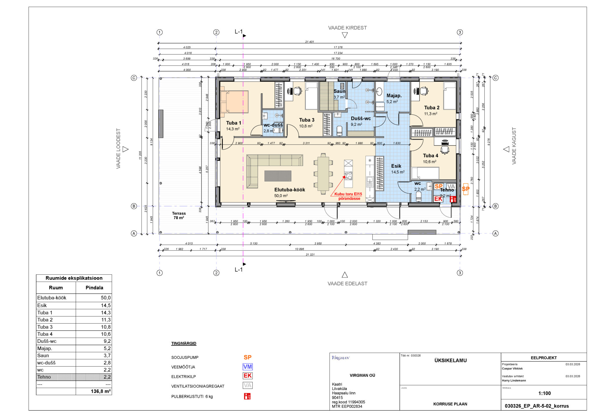 Villa on ühekorruseline lamekatusega modernne eramu, mille üldpind on 136,8 m². Maja süda on erakordselt avar 50 m² suurune avatud köök-elutuba, mis on tänu suurtele klaaspindadele valgusküllane ja ühendatud otse majataguse terrassiga.